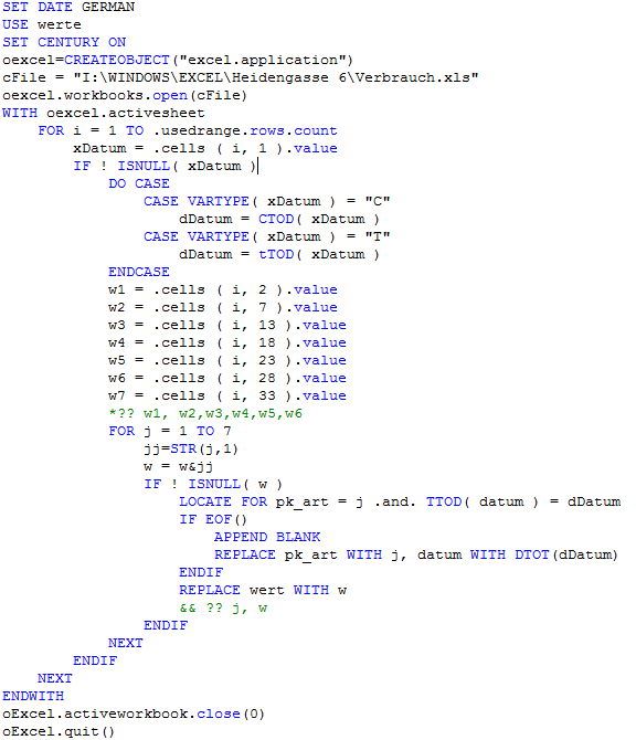 Die Daten aus der Excel-Tabelle habe ich schnell (so sieht das auch aus) per ODBC mit VFP in die SQL-Datenbank übertragen. Dabei habe ich der Einfachheit halber eine Datenbank mit einer Connection erstellt, das ist ein wenig komfortabler, da man so die SQL-Tabelle ganz normal als VFP-Tabelle verwenden kann.
